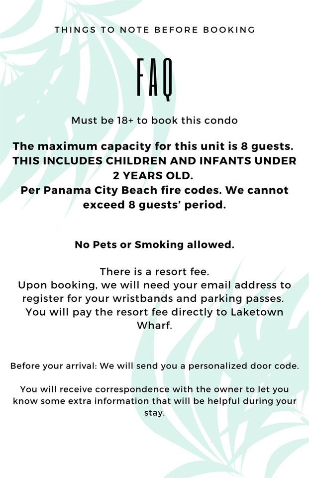 Age Requirement & Capacity Guests must be 18 or older to book. The maximum capacity for this unit is 8 guests, including children and infants under 2 years old, per Panama City Beach fire codes. Resort Fee A resort fee of $100.41 is required for each reservation, paid directly to Laketown Wharf. A link for registering cars and wristbands will be sent to you, after booking, with detailed instructions. No Pets or Smoking Important Notice Please note, no pets or smoking are allowed in the unit. If pets or smoking are detected, a $3,000 fine will be charged.