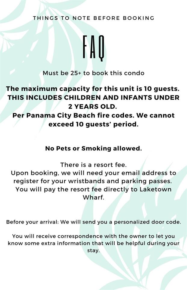 Age Requirement & Capacity Guests must be 18 or older to book. The maximum capacity for this unit is 10 guests, including children and infants under 2 years old, per Panama City Beach fire codes. Resort Fee A resort fee of $133.78 is required for each reservation, paid directly to Laketown Wharf. A link for registering cars and wristbands will be sent to you, after booking, with detailed instructions. No Pets or Smoking Important Notice Please note, no pets or smoking are allowed in the unit. If pets or smoking are detected, a $3,000 fine will be charged.
